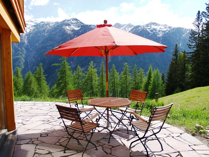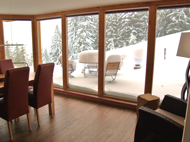 Terrasse mit Traumaussicht auf Berge und Skipiste